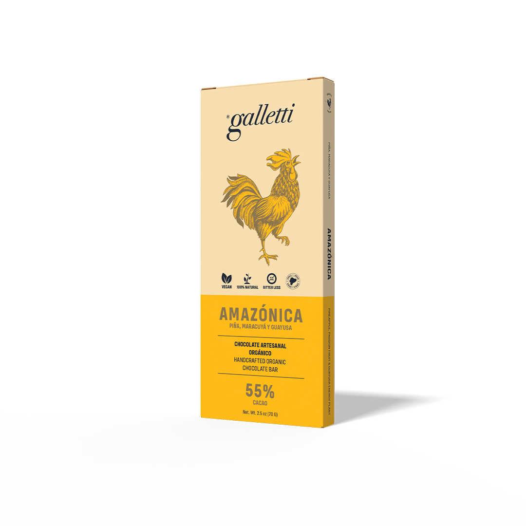 Barra de chocolate artesanal elaborado con piña, maracuyá y guayusa.