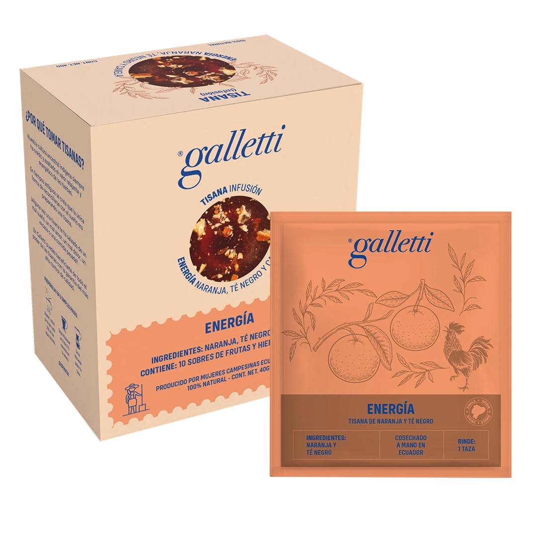 Ingredientes: Naranja, té negro y canela. Cada caja contiene 10 sobres de frutas y hierbas sueltas.
