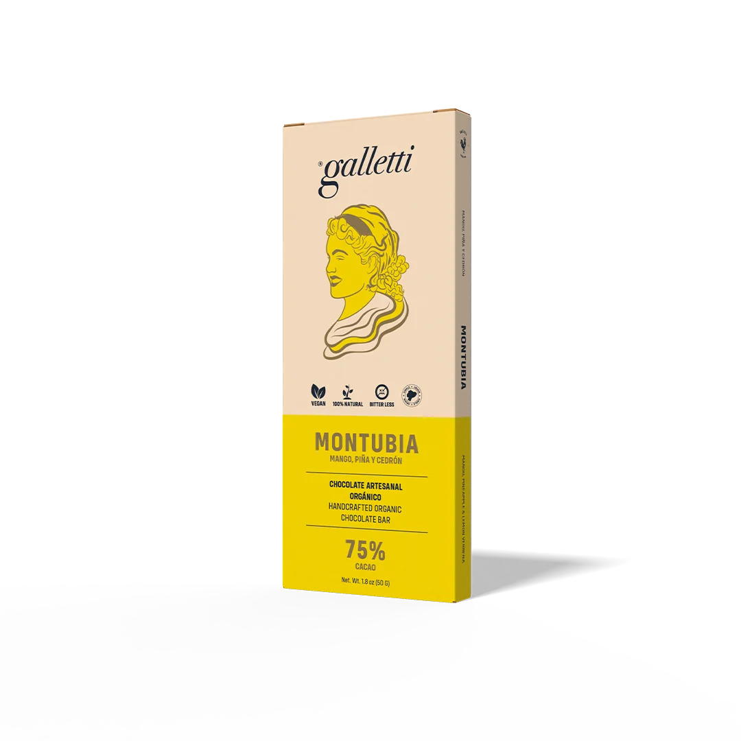 Barra de 50g de chocolate con cacao fino de aroma al 75% con mango, piña y cedrón. Vegan, 100% natural y con menos amargor. Una experiencia tropical montubía que combina la intensidad del cacao con frutas y hierbas de la región.
