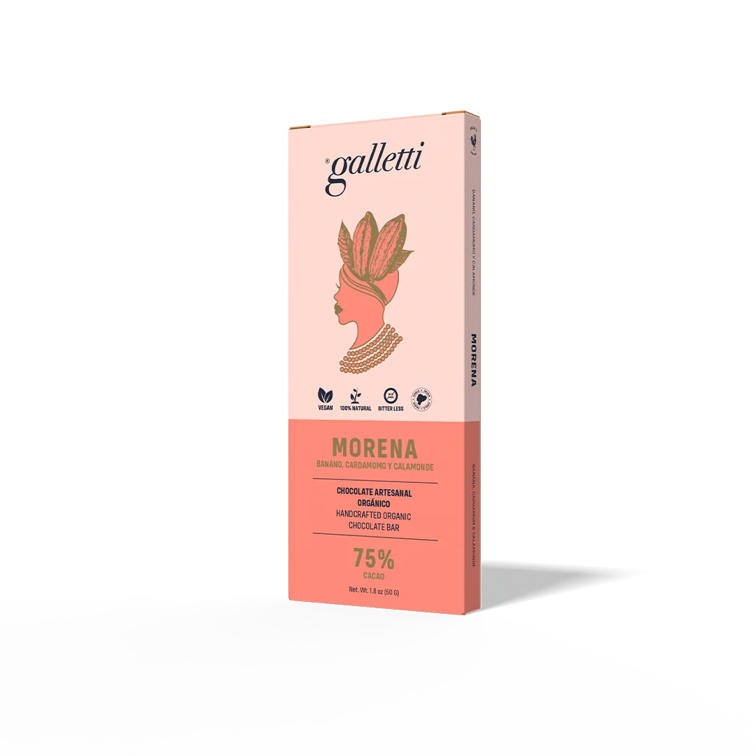 Barra de 50g de chocolate con 75% cacao fino de aroma con banana, cardamomo y calamondin. Vegan, 100% natural y con menos amargor. Una experiencia intensa que combina dulzura tropical, especias aromáticas y cítricos únicos.
